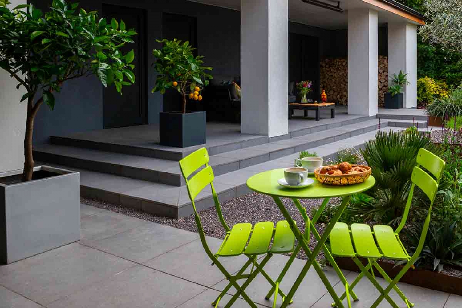 The hard landscaping is rectilinear in design to reconcile with the existing wraparound portico and the sloping nature of the site. The porcelain was selected to match with the clients existing tiles.