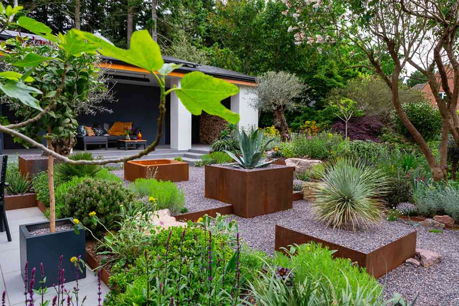 ‘We are absolutely delighted with our new, contemporary courtyard garden. It more than exceeds our expectations in terms of meeting the Client Brief. We love the interconnecting, terraced, mild steel retained planting beds and the way in which the naturalistic rock boulders ‘muscle their way’ through the sharp geometry of the steel. Not only are they beautiful, complementing the architectural forms of the courtyard planting, but they are practical too. Vantage seating points from which to sit and savour a morning coffee or a glass of wine and enjoy the delights of this tranquil space.