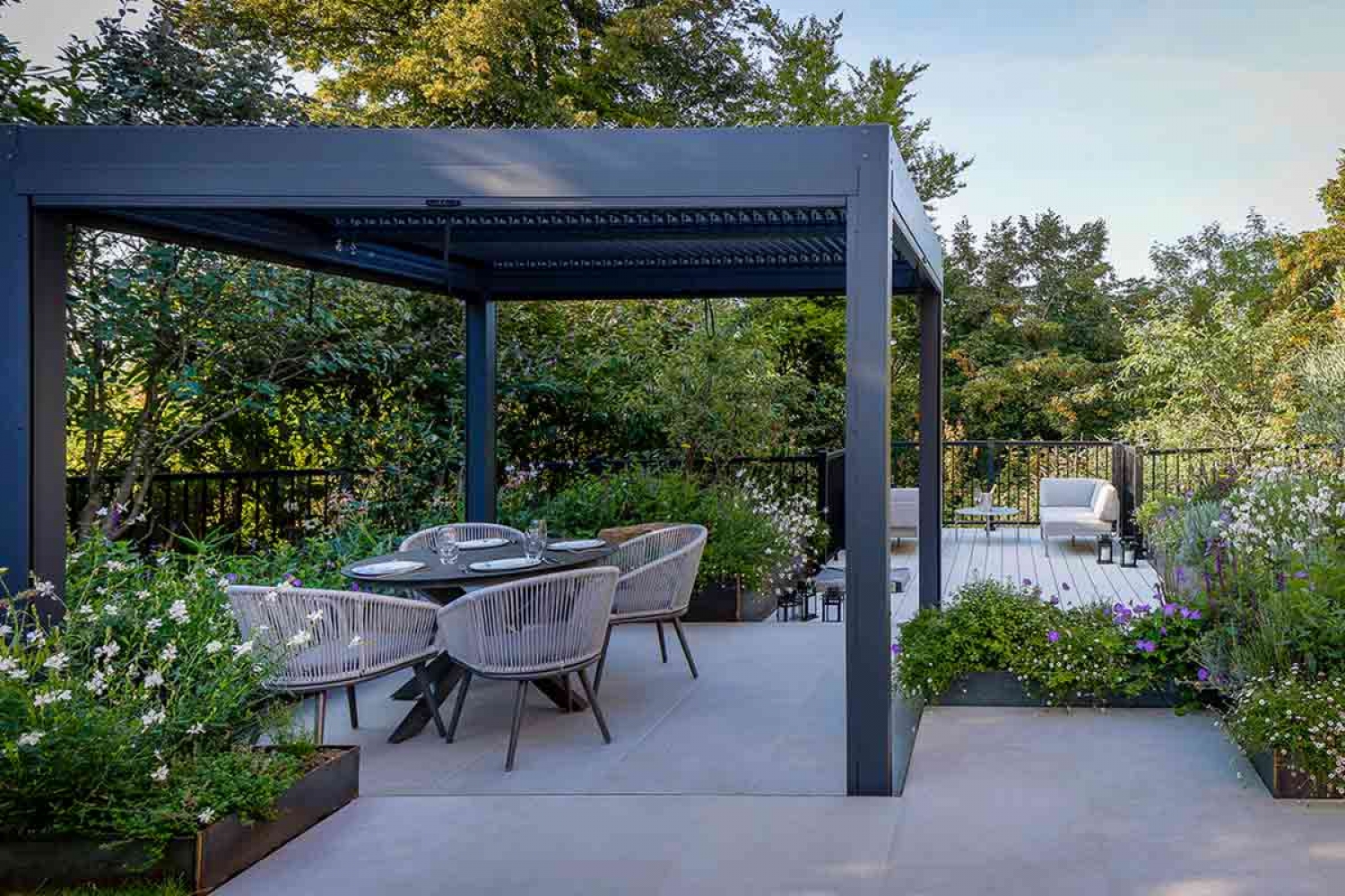 The deck was sunk into the existing level ground by 300 - 400mm, which allowed for the seating area to be screened from the neighbours by the new pergola and multi-stemmed trees.