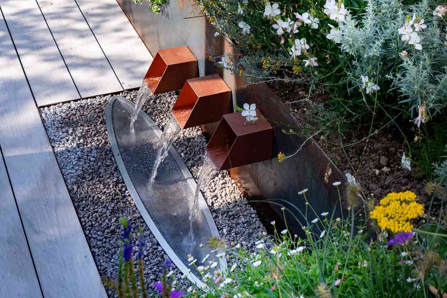 Within the deck, an integrated water feature was designed to add interest with three copper outlets flowing into a reservoir beneath the deck – it was positioned at the back of the deck to be enjoyed from either the dining terrace or from the seating areas over the escarpment.